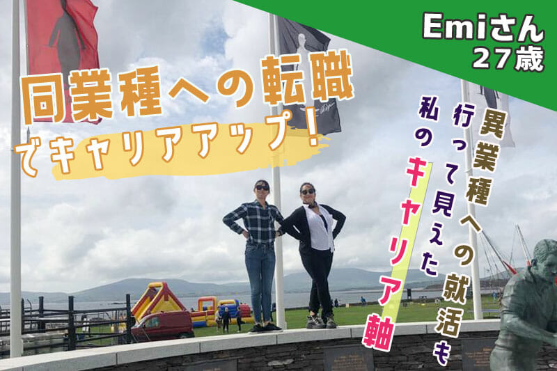 新卒から約4年間ホテルにて勤務されてたあと、学生時代からの目標であった留学へ。アイルランドでの留学生活では目標だった就業経験も積み、いざ始まった就職活動。はじめはやりたいことが見つからずもがいたEmiさんですが、結果的には同業種のより英語を生かせる環境へのキャリアップに成功!