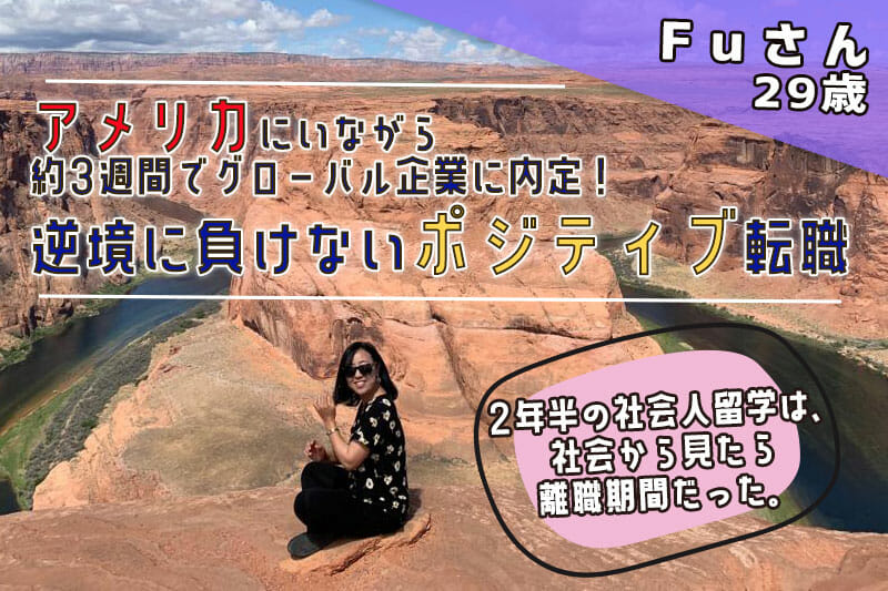 専門学校卒業後、外資系企業のバーにて、任せられるポジションもどんどん上がり順調にキャリアを積んできたFuさん。一方で、「もう一度アメリカに行きたい」という思いが高まり、退職を決意しオペアプログラムで渡米。最初は帰国に対し前向きになれなかったFuさんですが、第一志望の企業に出会い、本格的に就活を始めてから約3週間で内定を獲得!そんなFuさんの留学中の思いや就職活動についてお伺いしました。
